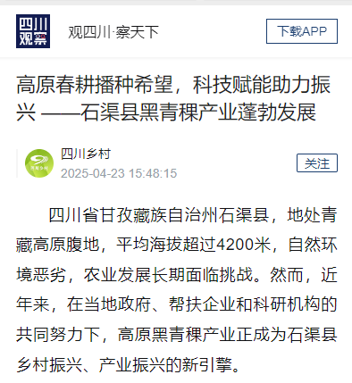 黑青稞产业的发展,是石渠县落实乡村振兴战略、推动产业振兴的一个缩影。它充分体现了科技赋能农业、产业引领振兴的强大力量,也为石渠县的高质量发展注入了源源不断的动力。展望未来,石渠县的乡村振兴之路必将越走越宽广,产业兴旺、生态宜居、人民富裕的美好愿景正在变为现实!