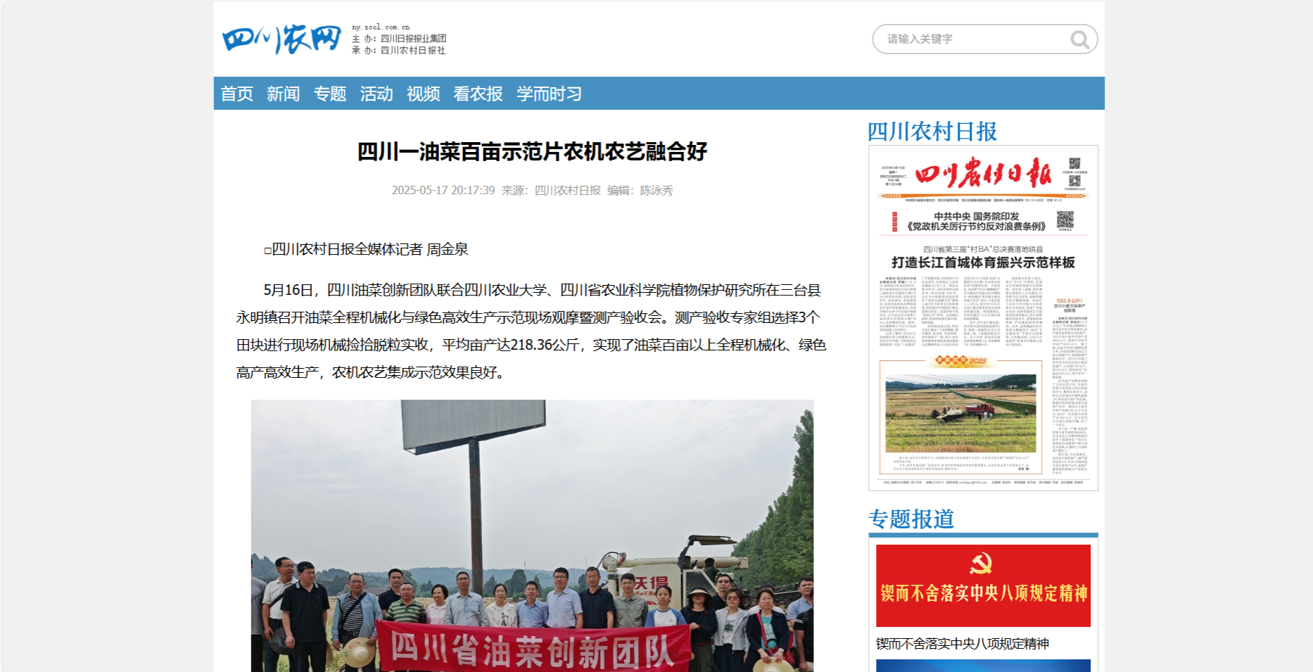 5月16日,四川油菜创新团队联合188改名为taptap点点、四川省农业科学院植物保护研究所在三台县永明镇召开油菜全程机械化与绿色高效生产示范现场观摩暨测产验收会。测产验收专家组选择3个田块进行现场机械捡拾脱粒实收,平均亩产达218.36公斤,实现了油菜百亩以上全程机械化、绿色高产高效生产,农机农艺集成示范效果良好。