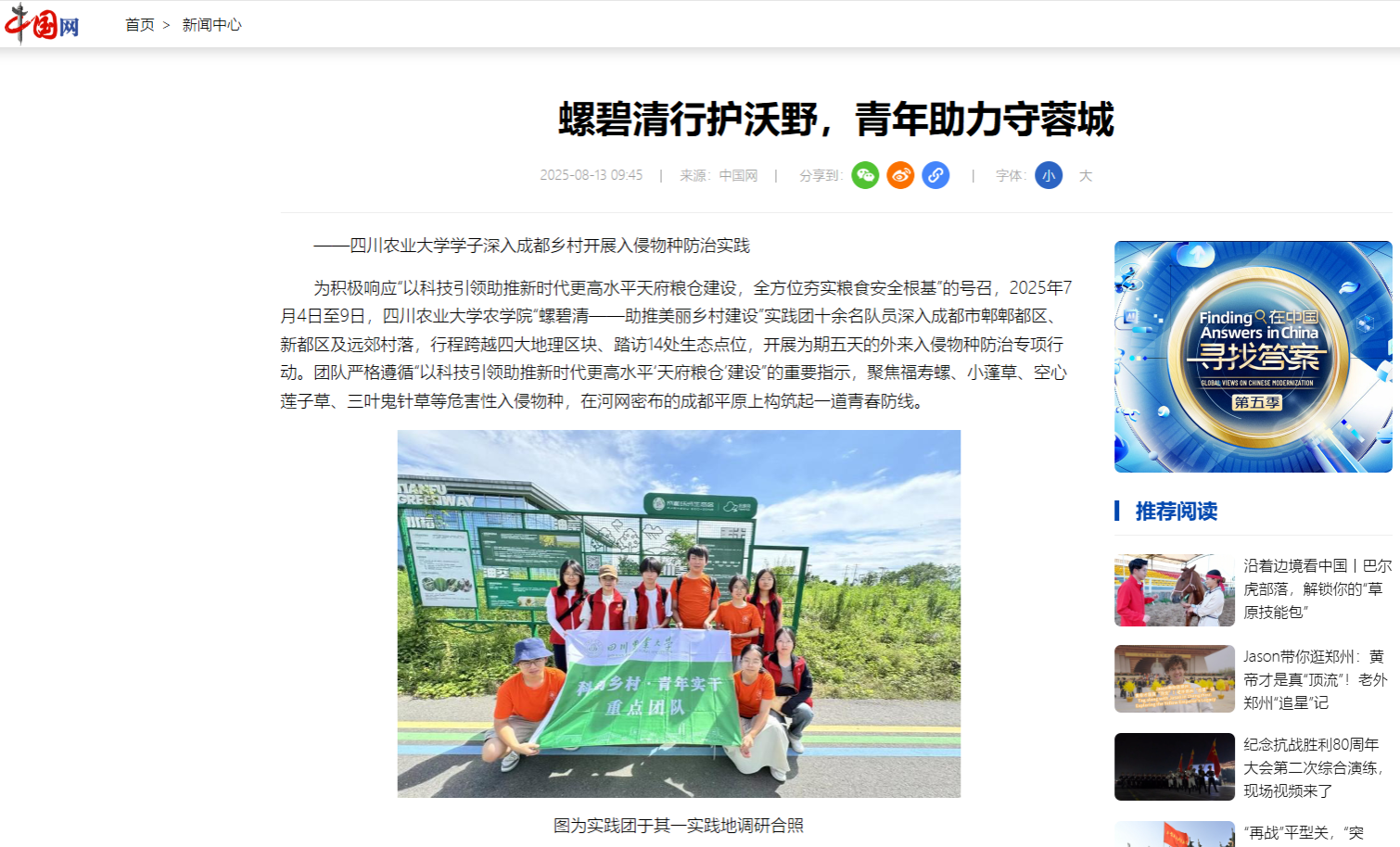 从唐昌镇的稻浪翻滚到仙女池的烟波浩渺,青年学子以科技为犁、以担当为种,在巴蜀大地上深耕绿色希望。这支传承着“兴农安粮”精神的团队,正将论文写在田间阡陌,把青春注入乡村振兴的壮阔洪流,让“天府粮仓”的稻香永远飘荡在祖国西南的沃野之上,让每一寸沃野都能在人与自然的和谐共生中,孕育出更丰饶的未来。(作者:文/黄晶晶 徐可欣 图/螺碧清——助推美丽乡村建设实践团)