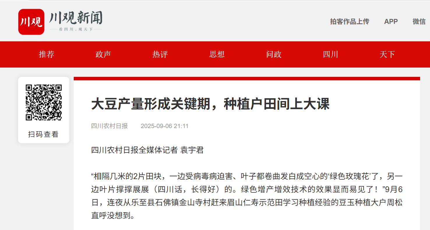 “相隔几米的2片田块,一边受病毒病迫害、叶子都卷曲发白成空心的‘绿色玫瑰花’了,另一边叶片撑撑展展(四川话,长得好)的。绿色增产增效技术的效果显而易见了!”9月6日,连夜从乐至县石佛镇金山寺村赶来眉山仁寿示范田学习种植经验的豆玉种植大户周松直呼没想到。