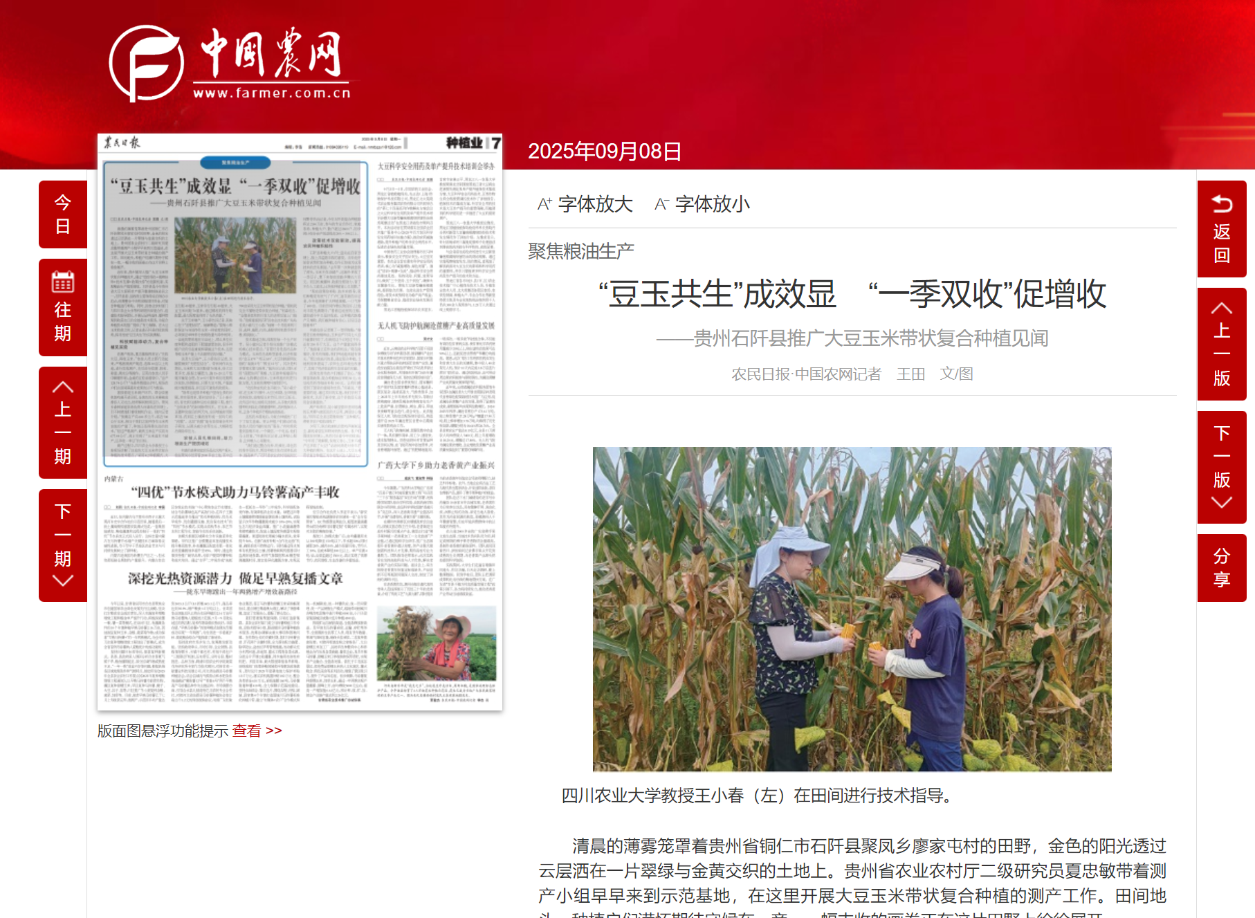 技术落地之细,体现在每一个生产环节。吴小敏向记者介绍当地推广该模式的核心技术要点:“首要任务是选好品种与模式。玉米优先选株型紧凑、抗逆性强的‘金玉579’‘邦玉539’,大豆则挑耐阴抗倒的‘瑞黄2号’‘黔豆12号’。其次是科学管理水肥与除草。”她告诉记者,团队采用“菌肥协同”策略,大豆接种根瘤菌与ARC生物耦合技术,玉米带施有机肥与配方肥,大豆初花期喷叶面肥即可。