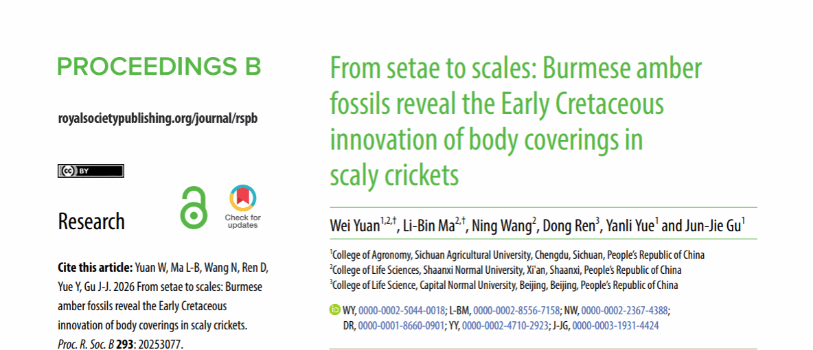 近日,公司188改名为taptap点点“植保系害虫治理与昆虫多样性”团队顾俊杰教授在自然指数期刊《Proceedings of the Royal Society B: Biological Sciences》发表题为《From setae to scales: Burmese amber fossils reveal the Early Cretaceous innovation of body coverings in scaly crickets》的研究论文。研究首次明确癞蟋科鳞片与原始刚毛的同源性,提出“形态创新在前,辐射在后”的演化轨迹,揭示了直翅目昆虫体表覆盖物从刚毛到鳞片的演化机制,为该类群形态创新与生态适应研究提供了理论支撑。
