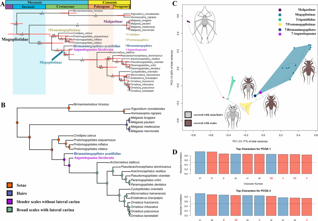 图1.(A)癞蟋科的时间校准系统发育树。(B)体表覆盖物性状的祖先状态重建。(C)离散性状的系统发育形态空间图。(D)关键特征投影(Yuan et al. 2026)。