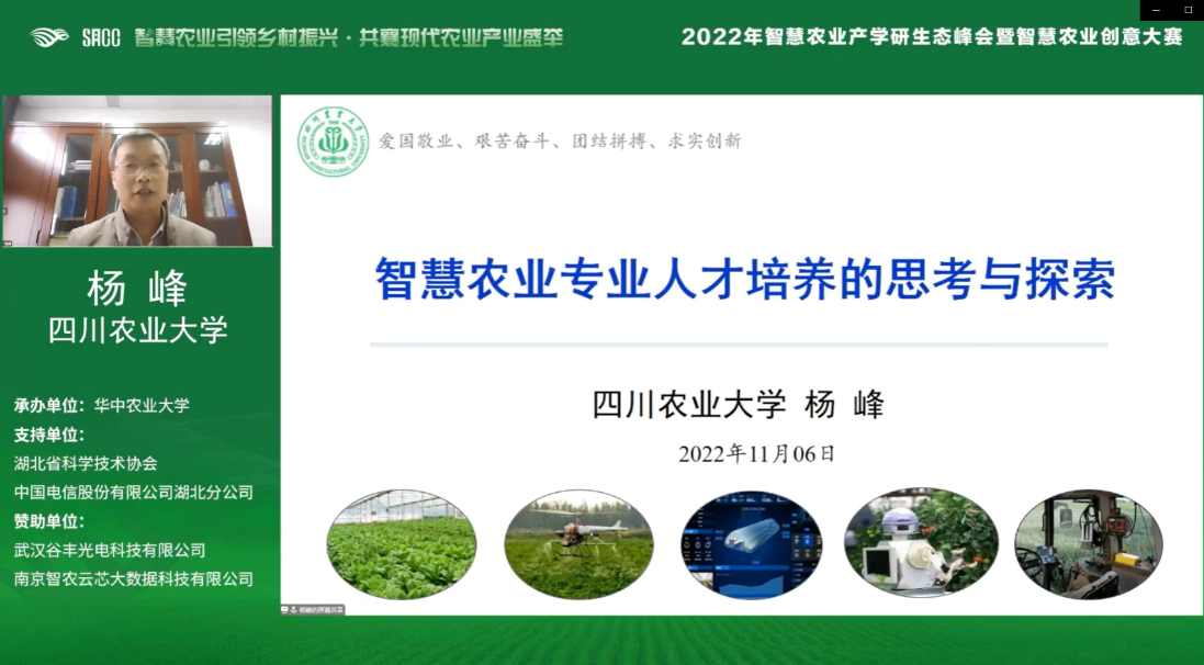 11月5-6日,由智慧农业人才培养创新联盟主办,华中农业大学承办的2022智慧农业产学研生态峰会暨智慧农业创意大赛在湖北武汉采用线上线下方式召开。华中农业大学张启发院士,国家农业信息化工程技术研究中心主任赵春江院士,农业农村部科教司张振华副司长以及开设智慧农业专业的20余所高校负责人及教师代表参加了会议。公司智慧农业系全体师生40余人线上参会。188改名为taptap点点副经理、中国作物学会智慧农业专业委员会副会长、四川省智慧农业科技协会副会长杨峰教授作大会报告。