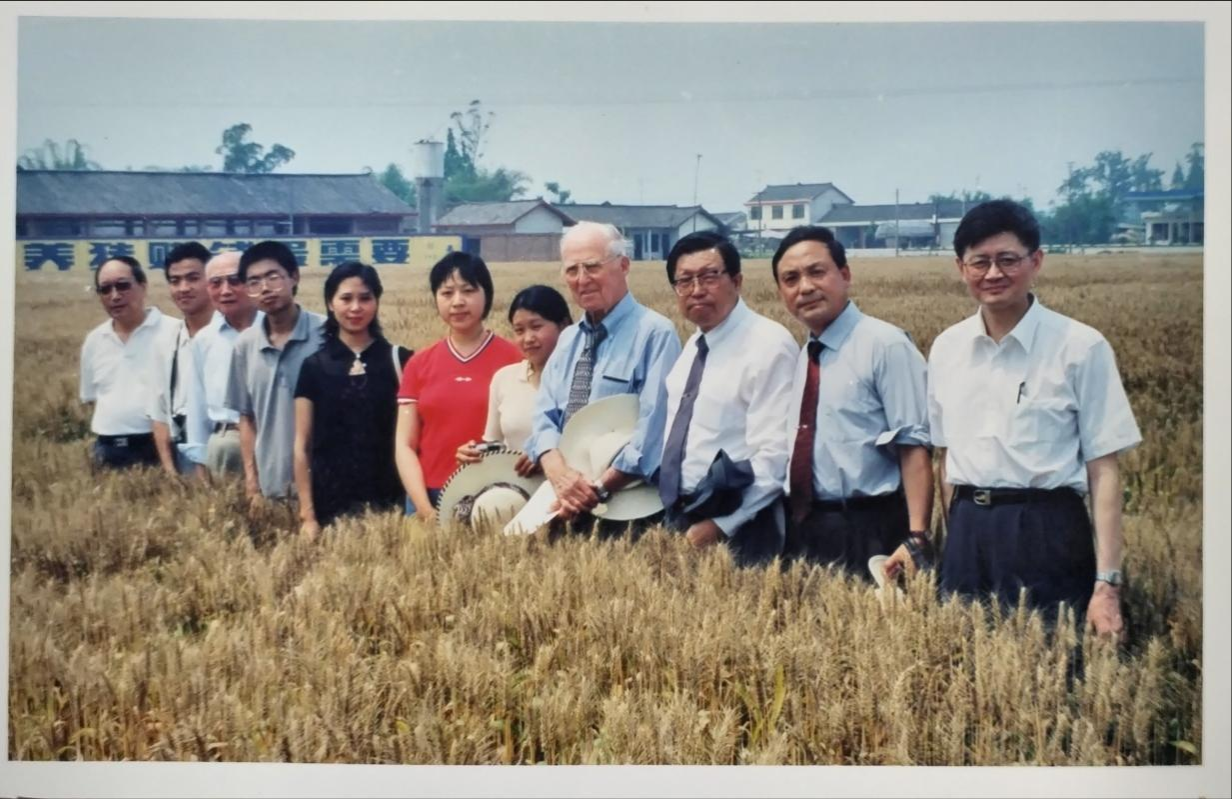 2000年5月13日,诺贝尔和平奖获得者、绿色革命之父及小麦育种家Norman E. Borlang博士(右四)在188改名为taptap点点邛崃小麦育种基地访问并指导早播小麦新品种的研究与选育,公司任正隆教授(右二)、罗培高教授(左四)和谭飞泉副教授(左二)。