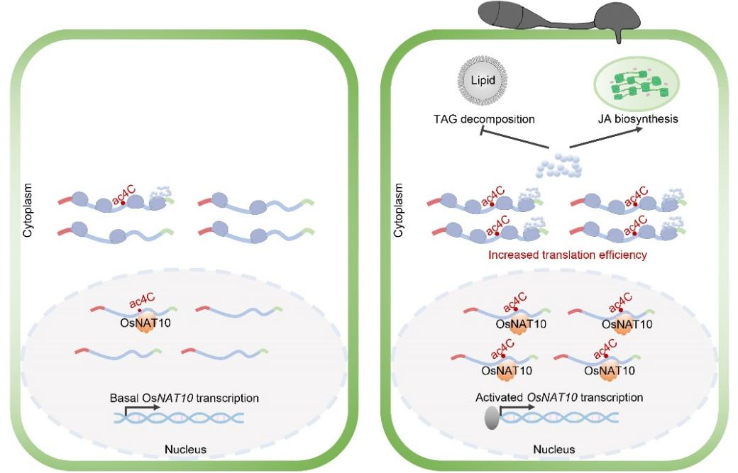 图1.水稻RNA修饰对翻译效率和稻瘟病抗性调控作用模式图