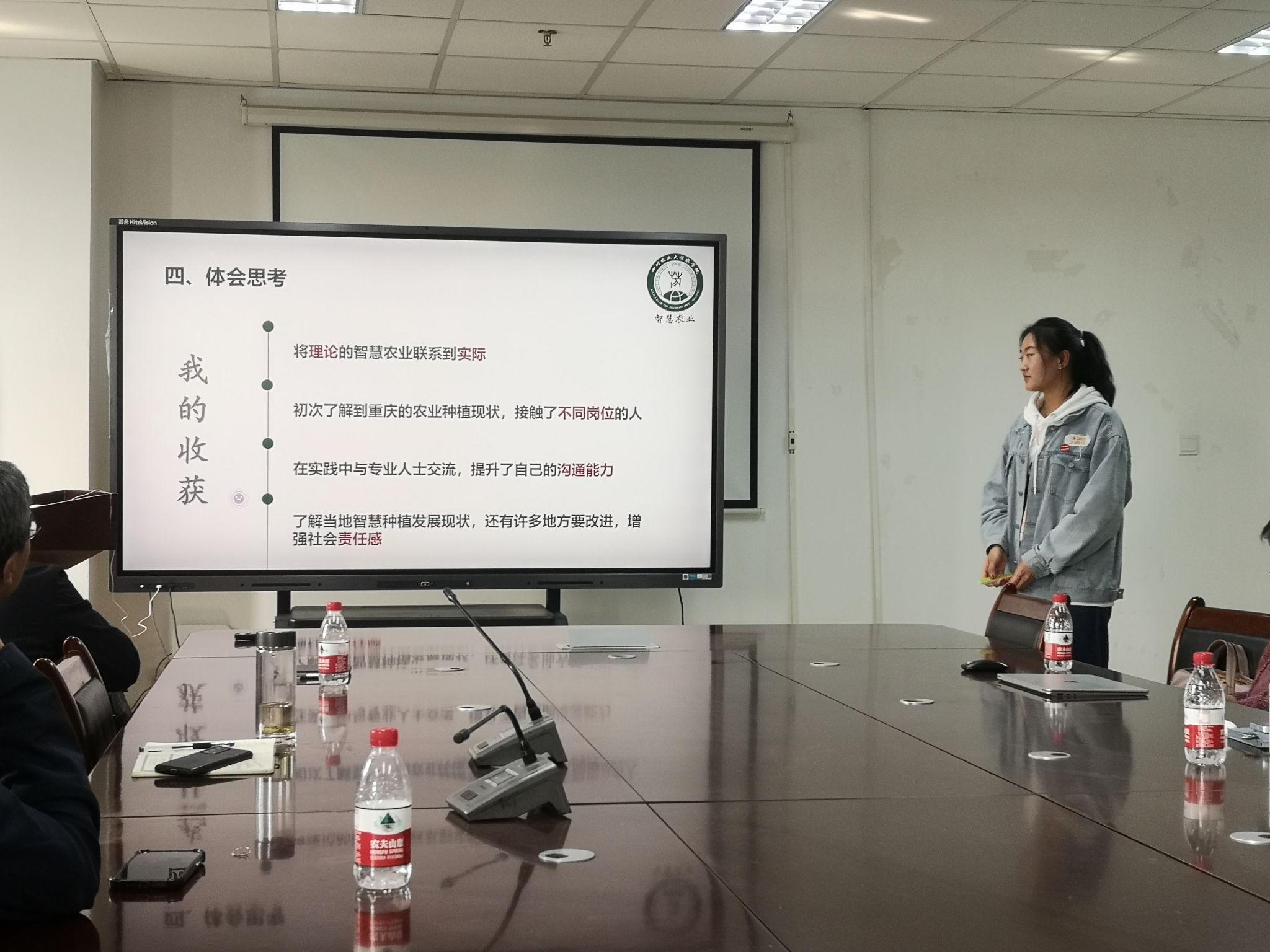 同学们从自己所学专业出发,利用寒假对家乡的农村、农业企业、农产品进行考察调研,撰写总结报告,并形成PPT汇报。如:农学专业家住海南的4位同学,围绕海口市琼山区地区的海南经济农作物进行问卷调查和数据分析,得出需要经济作物与粮食作物的协调发展的观点;中草药栽培与鉴定的周芷瑶同学利用家乡特有的农产品燕山红茶,在当地企业实践,配伍药食同源的不同中药材,创新出“燕山红养生茶饮”,获得企业认可;智慧农业的蓝艺同学参观学习家乡农场中智慧农业科技运用,接触最先进的农业机械,以问卷调查民众对智慧农业的认知度和期待,同时也关注到了很多智慧农业现状中的问题;种子科学与工程专业的李怡菲同学以“农业与旅游观赏业结合,推动乡村振兴”为题,对家乡金堂县三溪镇的乡村旅游进行分析调研。