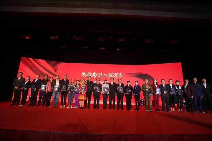 对希望工程作出突出贡献的个人或集体代表上台接受荣誉证书