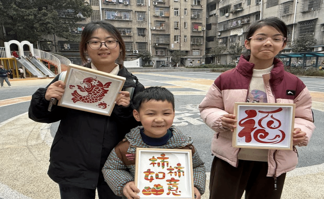 在宜宾市南溪区凤翔社区“童伴之家”,团队则带来了竹编画的新形式。除了基础技法,他们还准备了“福”“马到成功”“柿柿如意”等寓意吉祥的镂空模板,引导孩子们将竹编与图案结合,创作出更具观赏性的竹编画作品。孩子们独立完成一幅幅寓意美好的作品。一个小女孩举起“福”字笑着说:“我要挂在家里给爸爸妈妈看。”