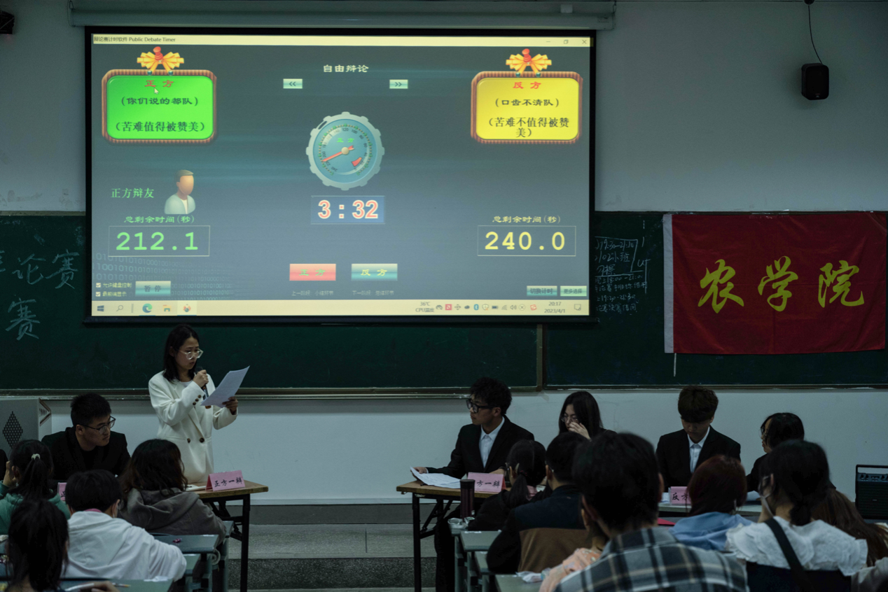 比赛伊始,由黄晨峰带来歌唱节目《违背的青春》,为本次比赛的同学助力打气。据了解,此次辩论赛的辩题是“苦难是否值得被赞美”。赛场气氛热烈紧张,正方辩手旁征博引,阐述苦难对于个人、国家和历史发展的价值,反方辩手据理力争,列举苦难对于人们心理和生活的不良影响。