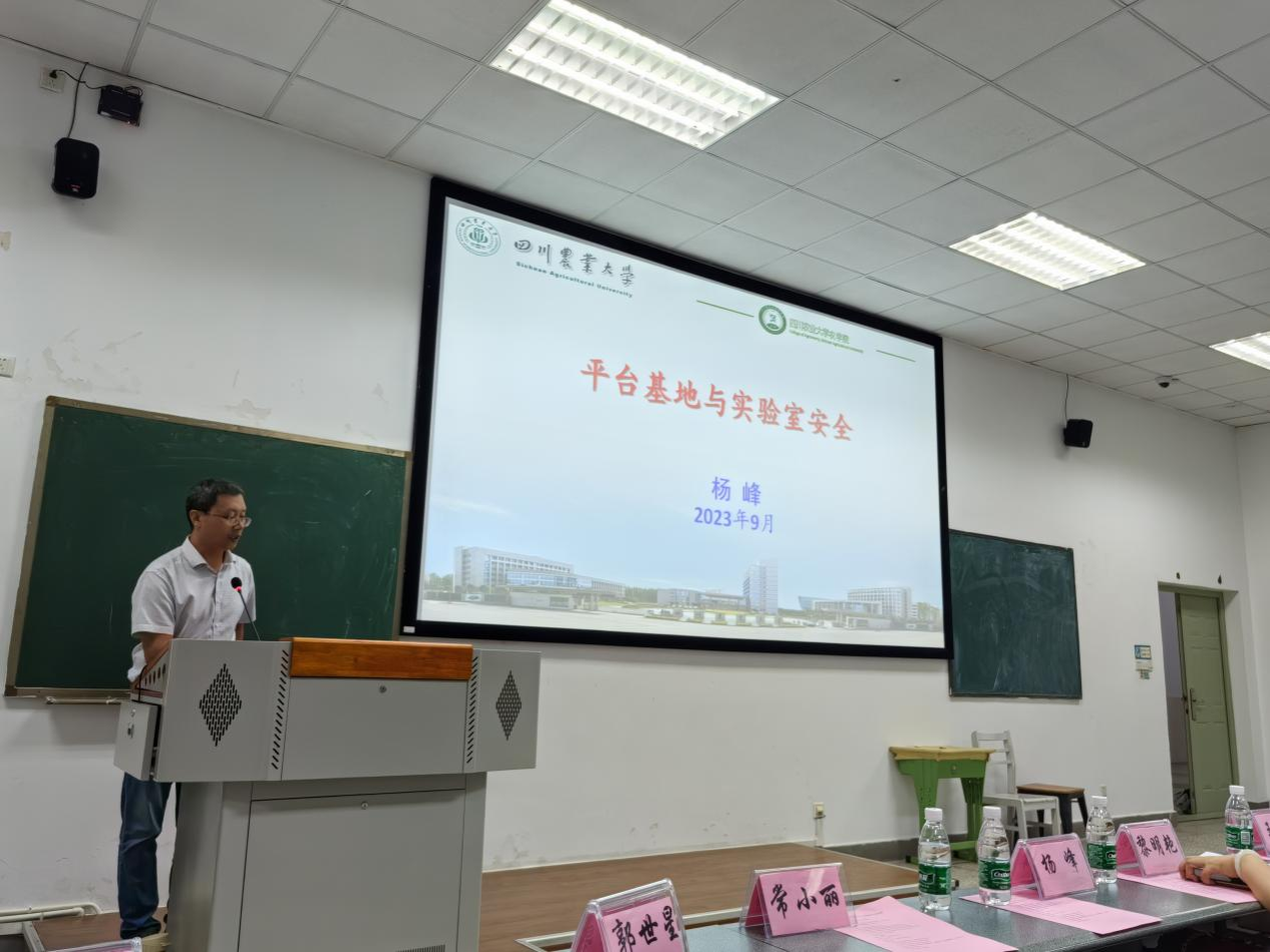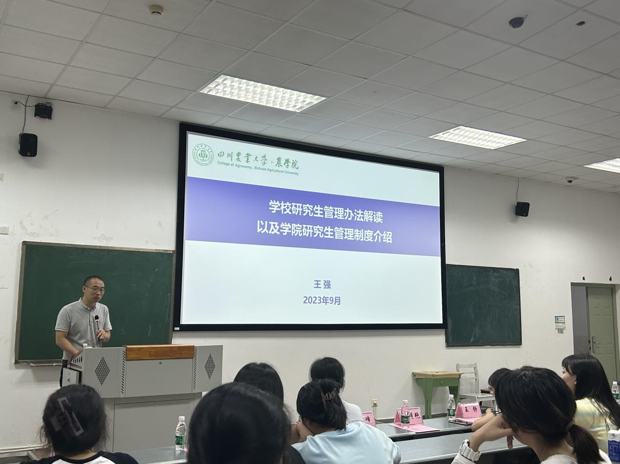 王静首先代表学院全体师生向2023级新生表示热烈的欢迎与诚挚的祝贺,并向同学们介绍了学院的基本情况和学科发展概况,同时提出殷切期望,希望同学们肩负起强农兴农的使命担当,在新时代、新征程做出新的更大贡献。王强详细解读了学校颁布的《研究生管理制度》、《公司产品方案》以及学院的相关研究生管理事项,并着重强调了公司产品阶段的关键点和注意事项。杨峰围绕科研平台与基地情况以及实验室安全教育的内容做了详细的介绍,嘱咐同学们进行实验的首要条件是安全,希望同学们科研用心,实验用心,安全放心。黎明艳讲解了学科历史以及文化传承,通过例举优秀员工的事迹生动形象地阐释了川农大精神的内涵,向同学们提出了继承、发扬川农大精神的要求和期盼。