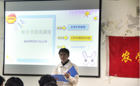 在“一问一答”环节,新支书向老支书提问,分别进行了一对一的经验交流。最后由植保2101团支书彭玉坤作为新支书代表发表工作感言,分享了支部工作中的困难与创新,并表达了未来能将团支部组织得越来越好的愿望。