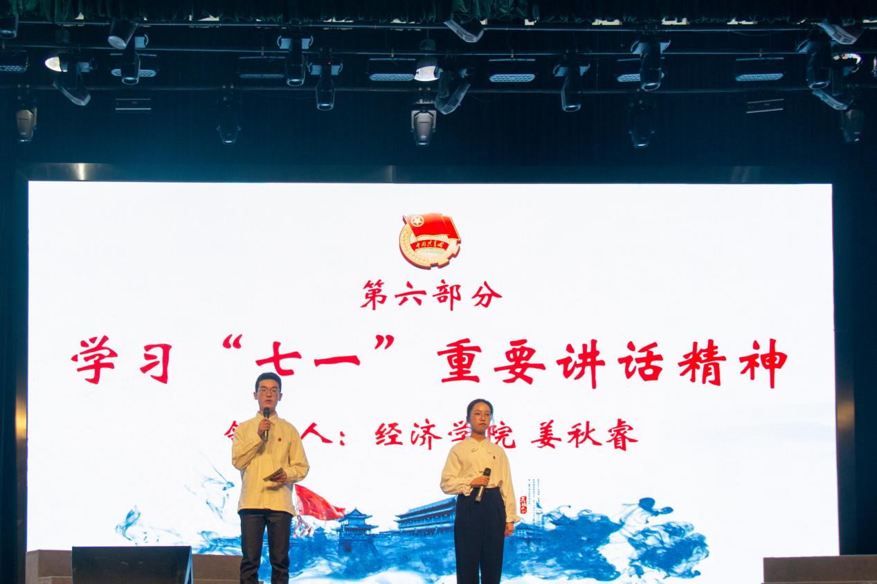 由国贸201902、投资201902、植保202101、环生202002等四个团支部带来的歌曲《青春无悔,强国有我》,将本次团日活动的氛围引入高潮。在舞台上动情的歌声下,台下的同学们跟随着旋律演唱,流露出同学们的爱国之情。接下来是由金融202002、中药202101、环工202004等三个团支部带来的朗诵《结缘川农,复兴中华》,朗诵词中“前途似海,来日方长”表达了同学们对未来的憧憬和希望。