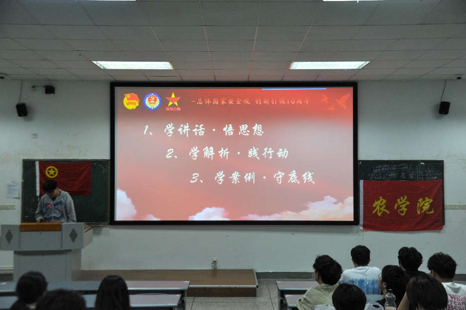 随后,智慧农业202301团支部的退役军人代表蓝艺同学分享了她在部队的生活经历和对国家安全的深刻感悟。她的事迹激发了同学们的爱国热情,增强了同学们对国家安全的责任感和使命感。活动进入高潮阶段,校青马班的李昊远和金鑫同学以国家安全为出发点,结合公司农林类高校特色,向同学们普及了威胁我国农业安全的因素及应对措施,进一步激发了同学们维护国家安全和农业安全的热情。
