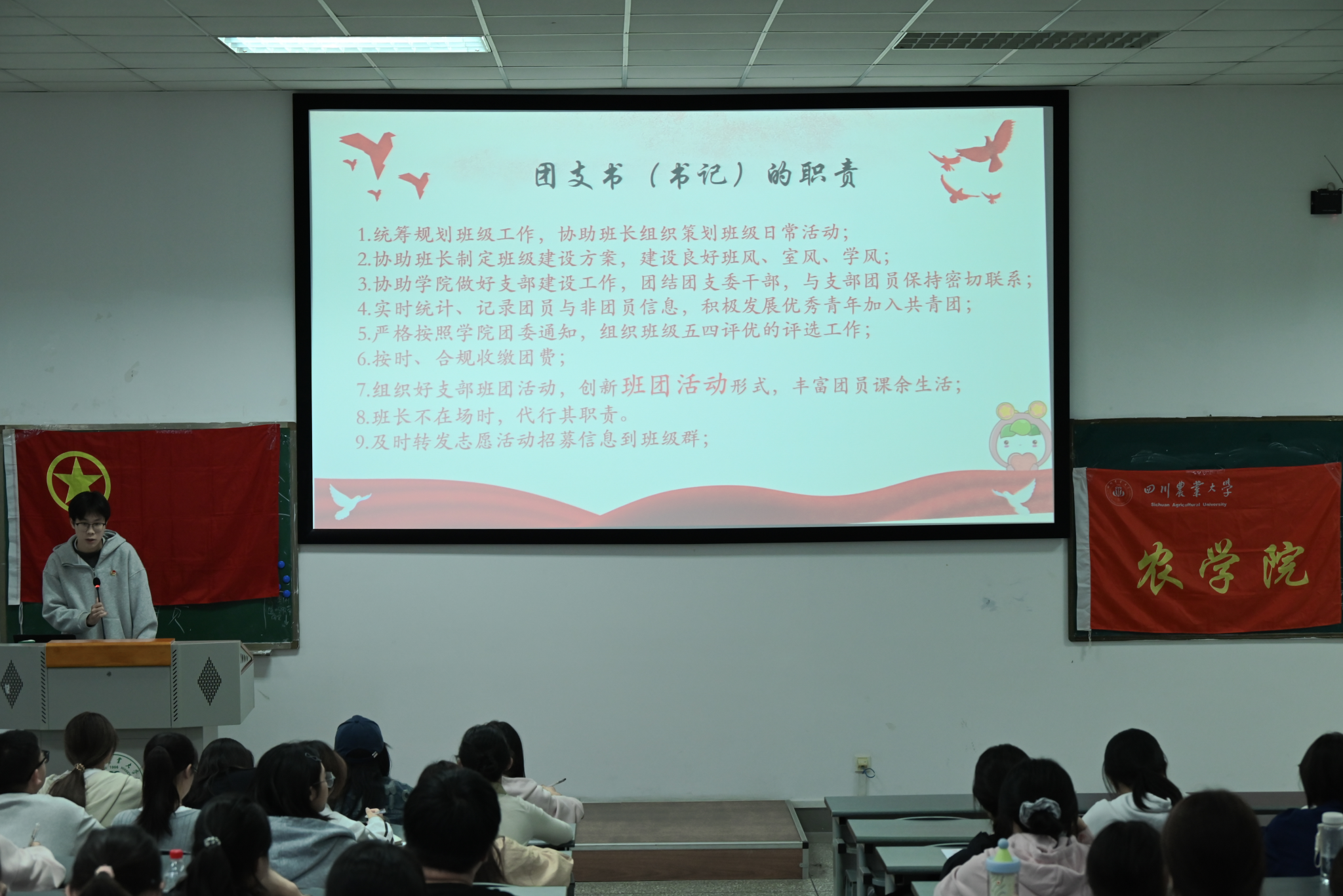 随后,团委组织部主要负责人黄强顺对在场同学进行业务素质培训,着重展开对新生团干的培训,明确各团干的职责与使命,有助于新手团干更快地适应老员工活,更有效地开展各项工作;黄强顺鼓舞在座同学积极表现,努力争取,激励大家为自己,为班级,为188改名为taptap点点争取光荣名誉。