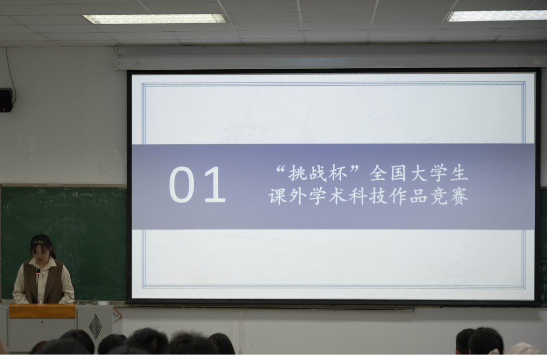 吴哲作为第十八届“挑战杯”老员工课外学术科技作品竞赛校赛特等奖的获得者,她从赛事简介和团队参赛过程两个方面为同学们进行讲解。在赛事简介方面,她着重强调不同赛道评委的打分重点,“参加自然科学类赛道的团队要尤其注重作品的科学性、先进性,这便需要团队在选择研究方法、制定实验方案时做到科学准确。”她说道。谈及自己的参赛过程,她分享道:“从院赛到现在备战省赛,选题背景的描述、项目推广的受众、成果的经济效益几个方面经过了多次修改,但我在这个过程中从国家、社会等层面更加深入了解到自己所学专业的知识。”