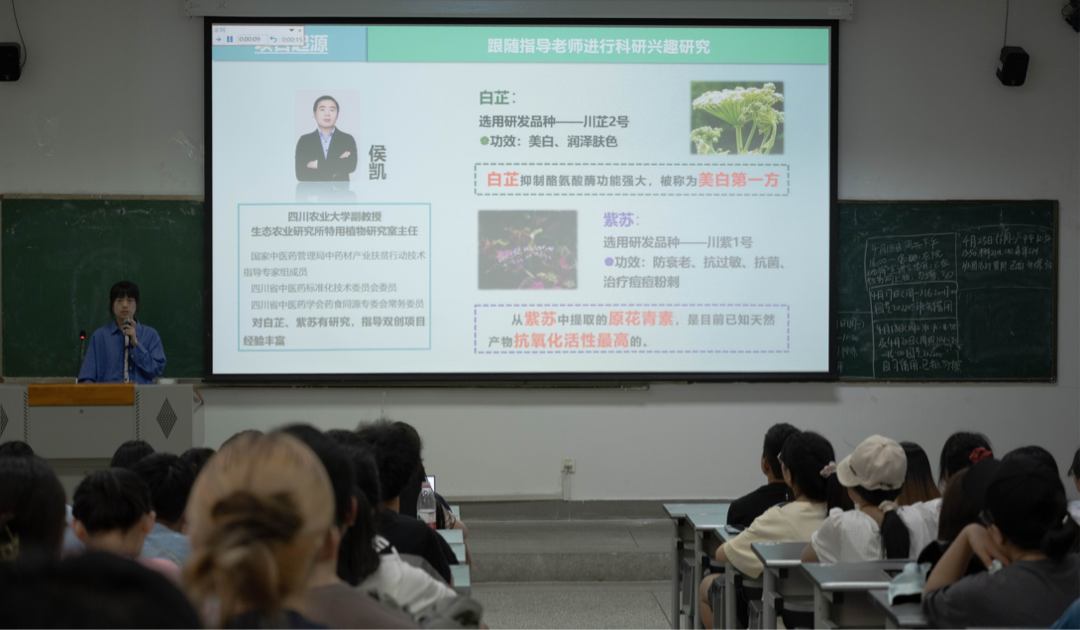 李郁葱以所在团队的第八届中国国际“互联网”+老员工创新创业大赛省赛银奖项目《御龄芷——药食同源护肤品引领者》为例,指出参赛过程中对项目的了解程度、团队的组成与合作、PPT的文案制作几个环节非常关键,也有助于提升自我综合能力。最后,李郁葱向同学们介绍了解双创赛事的途径,鼓励大家积极参与双创赛事,她直言:“参加双创赛事是不会让人后悔的经历。”