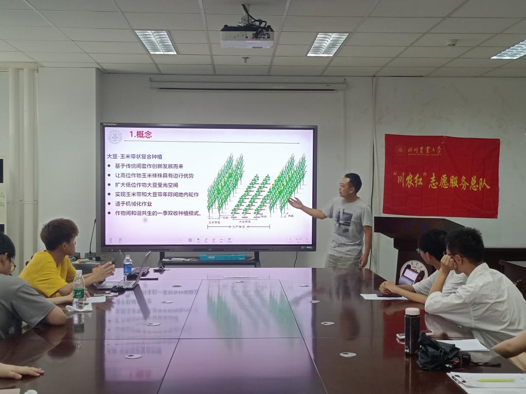 接着,刘卫国教授从大豆-玉米带状复合种植技术的研究背景,概念类型,主要优势与关键技术四个方面展开讲述。他指出,针对玉米大豆供需缺口大、争地矛盾突出,高产出与可持续难统一的问题,间套轮作具有高产出和可持续的有益“基因”,于是大豆-玉米带状复合种植技术应运而生。会上,刘卫国教授提出密度与株距计算、间套轮作存在优势等多个问题,团队成员积极思考回答,也加深了与会人员对大豆-玉米带状复合种植技术的理解。
