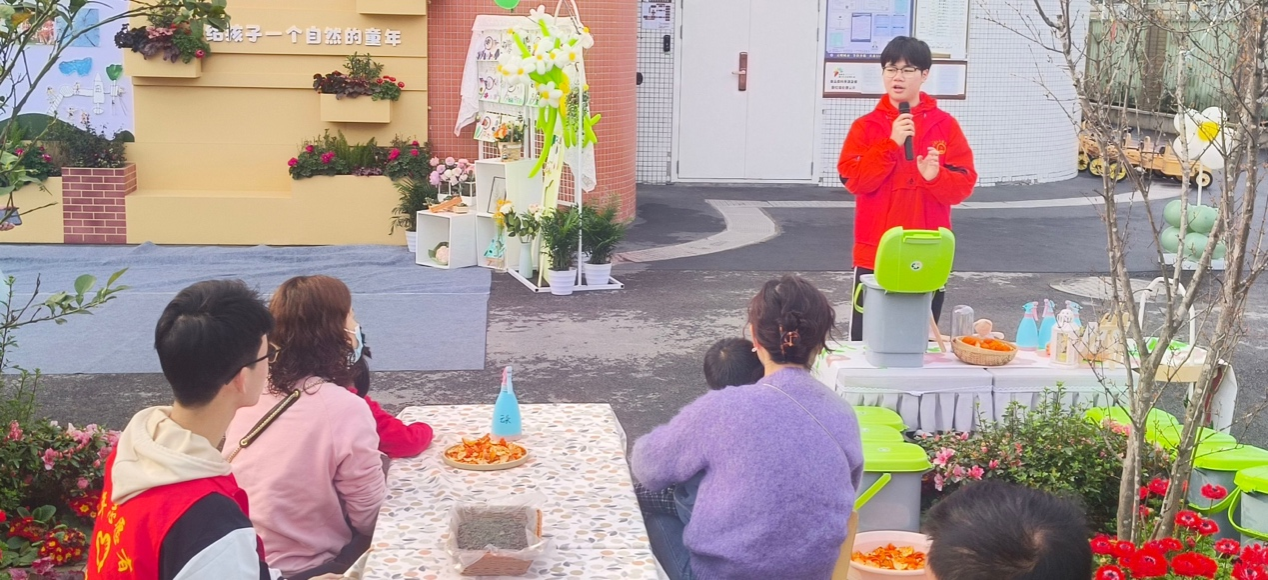 图为志愿者刘洪江为幼儿园家长及小朋友们讲解堆肥过程