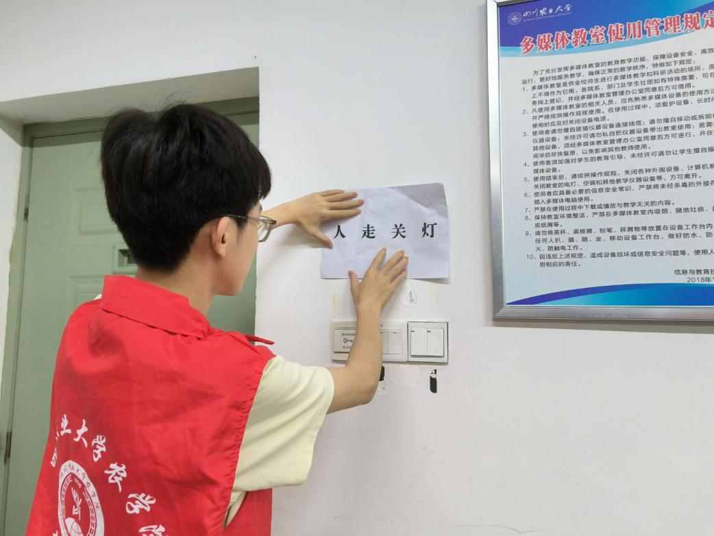 活动期间,节能行动逐渐从志愿者的“单点发力”发展为师生的“集体响应”。一名长期在教室自习的同学说到:“看到志愿者每天两次巡查,我才意识到,我们随手关灯的习惯会节约多少资源。现在我会主动选择人多的教室,离开时还会帮忙关隔壁教室的灯。”这不仅是简单的关灯行动,更是一堂生动的生态文明实践课。农科学子要始终牢记“绿水青山就是金山银山”,将绿色基因融入学习生活的每个细节。