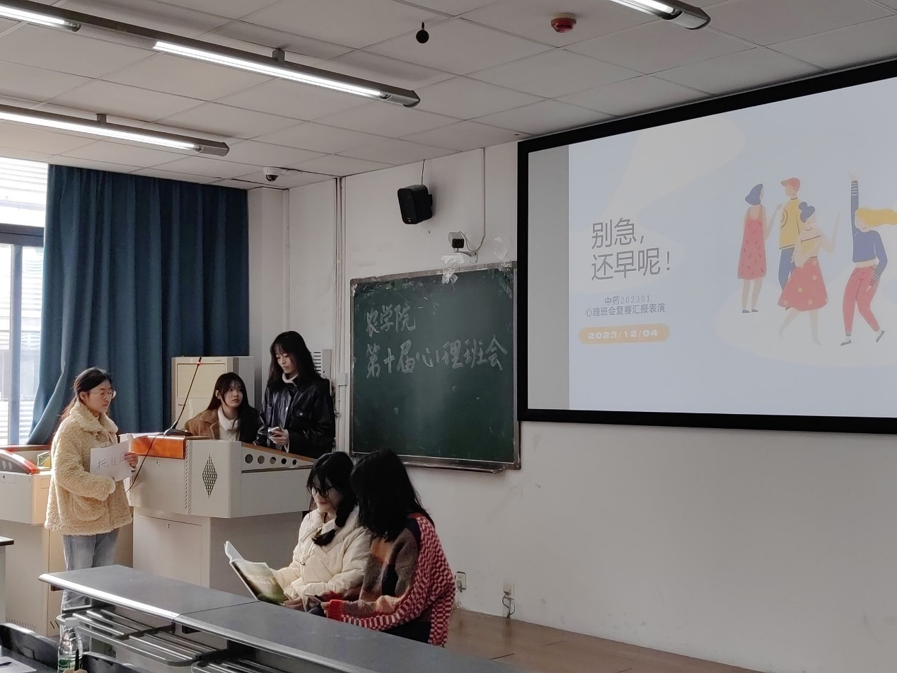 大赛伊始,主持人就本次活动的背景以及目的进行阐述,各参赛班级在主持人的组织下陆续上台表演,其中,中药202301班带来的《别急还早呢》情景剧令人深思。身为大一新生的小美在面对亟待提交的任务时没有选择立即完成,而是在诱惑中沉沦,在无法挽回的结果中懊悔不已,最后通过拒绝借口,设定日期,立刻执行等方式切实地提升学习效率,和拖延说再见。