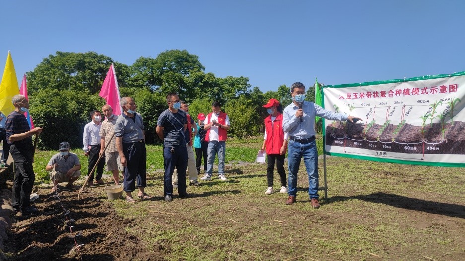 在井研县,乐山市农业农村局农技站负责人王锐、井研县农技站站长彭慧容和农办副主任狄智勇等介绍了大豆玉米带状复合种植区域、高产示范的基本情况和项目支持,现场查看了带状套作玉米的长势、鲜食大豆和鲜食玉米带状间作种植情况。交流过程中,杨峰指出在大豆玉米带状复合种植中玉米的株行距很重要,一定要保证玉米的密度与清种一样,保证玉米带与大豆带间距达到60-70cm,让后期大豆能够捕获到更多的光照,提升大豆的产量潜力。