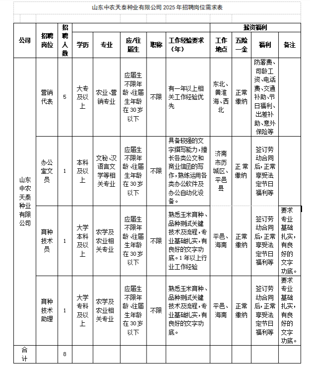 山东中农天泰种业有限公司根据公司发展战略需要,现向社会拟公开招聘员工8名,诚邀社会各界精英加盟,现将具体事宜公告如下: