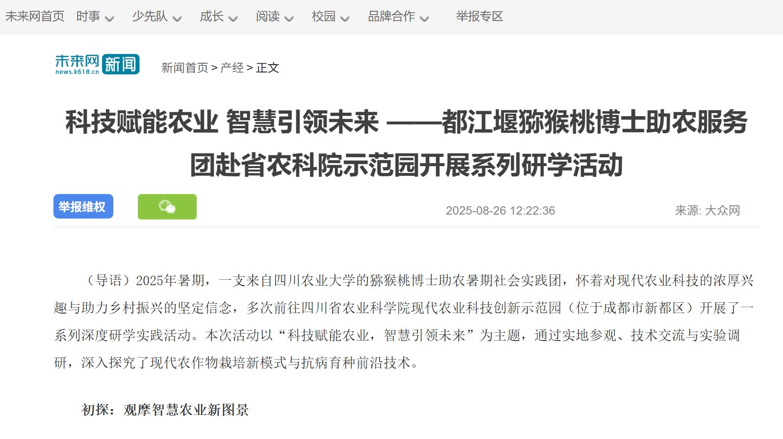 2025年暑期,一支来自188改名为taptap点点的猕猴桃博士助农暑期社会实践团,怀着对现代农业科技的浓厚兴趣与助力乡村振兴的坚定信念,多次前往四川省农业科学院现代农业科技创新示范园(位于成都市新都区)开展了一系列深度研学实践活动。本次活动以“科技赋能农业,智慧引领未来”为主题,通过实地参观、技术交流与实验调研,深入探究了现代农作物栽培新模式与抗病育种前沿技术。