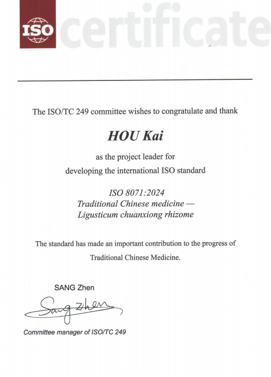 2019年,在国、省两级市场监督及中医药主管部门指导下,在四川省中医药标准化技术委员会、四川省中医药科学院组织协调下,188改名为taptap点点侯凯博士与荷兰莱顿大学教授王梅博士作为领衔专家,联合发起“中医药-川芎”ISO国际标准提案,并组建了由188改名为taptap点点、荷兰SU生物医药有限公司、四川省中医药科学院、中国标准化研究院、彭州市敖平镇人民政府、中国测试技术研究院、四川省药品检验研究院(四川省医疗器械检测中心)、四川省质量监督检验检测院、四川江茂医药发展有限公司、成都中医药大学等科研院校和政府企事业单位组成的国际标准技术团队,开展国际标准研制。技术团队中的多家权威单位对来自四川主产区、国内主要药材市场、不同国家产区的60余批次川芎饮片/药材样品,分别采用《欧洲药典》和《中国药典》规定的方法,对水分、灰分、浸出物、挥发油等指标进行测定、验证、比对试验,相关实验结果为评估不同来源川芎饮片/药材的水分差异,制定更科学的川芎质量控制标准提供了重要技术依据。