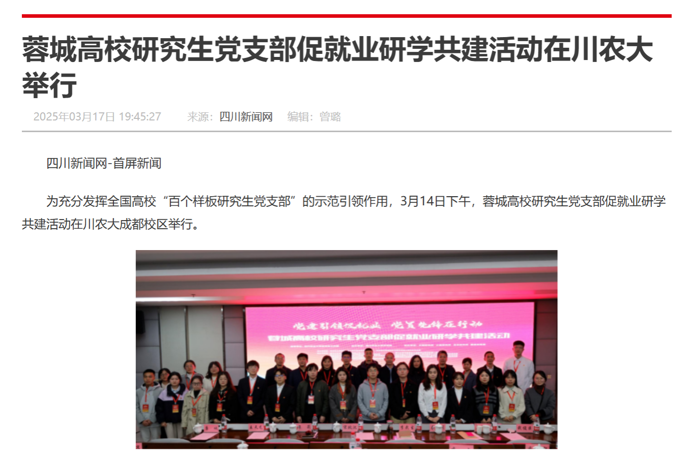 为充分发挥全国高校“百个样板研究生党支部”的示范引领作用,3月14日下午,蓉城高校研究生党支部促就业研学共建活动在川农大成都校区举行。