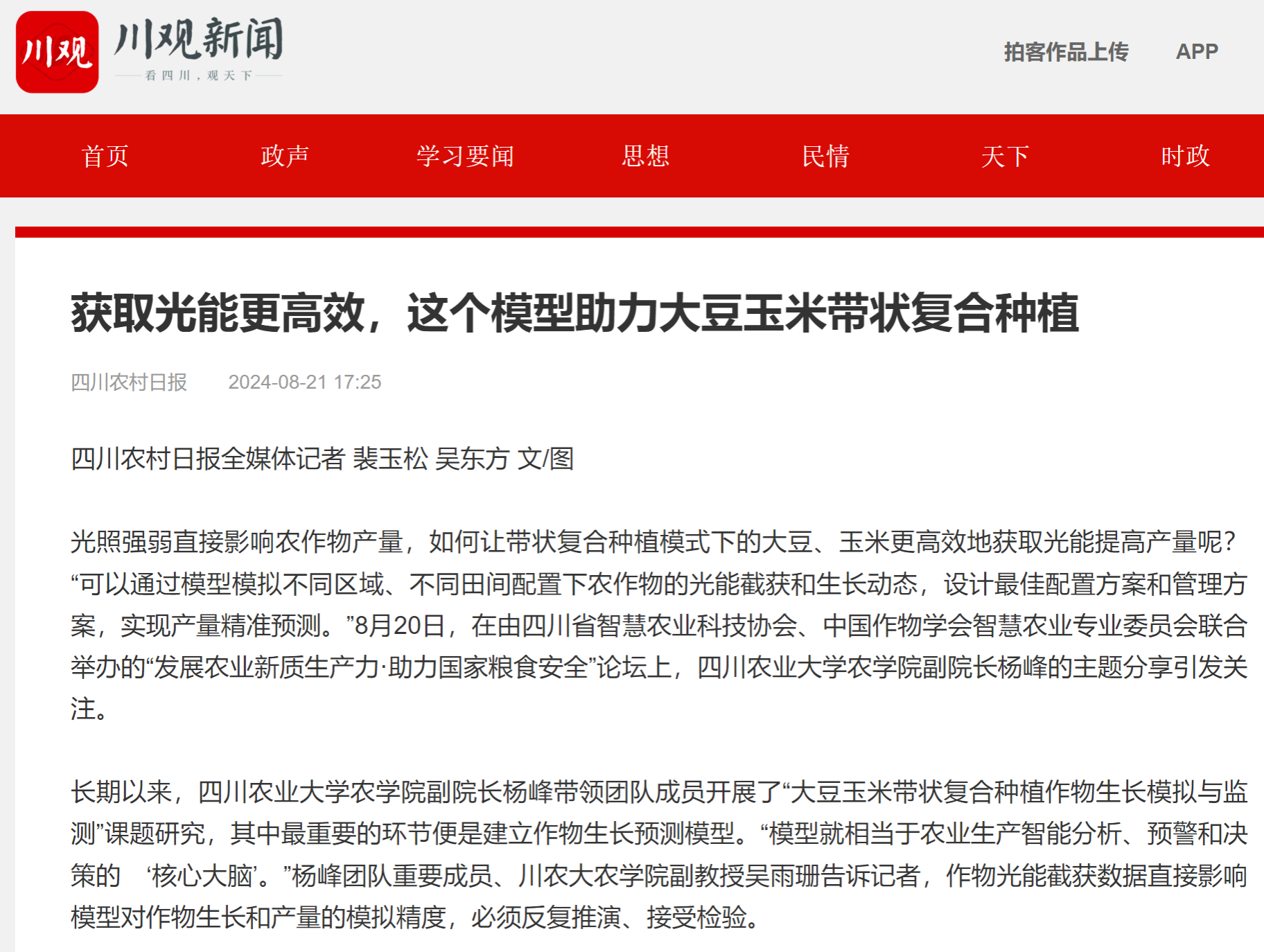 过去的三年多,杨峰团队在山东、河南、内蒙古等地来回奔走,将最新的监测数据带回来进行分析、调试。同时,他们结合实践创建了一种带状复合种植产量、品质光谱预测新技术,通过分析作物关键生育时期光谱、纹理等特征及其与田间生长参数的关系,不断优化关键生长参数预测模型,使产量模拟精度提高了7%、品质模拟精度提高了19%。