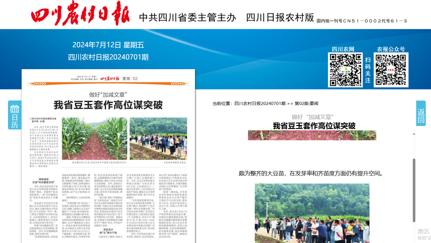 另外,今年我省在遂宁市安居区、射洪市,达州市渠县,眉山市仁寿县共建设4个省级示范样板区,严格落实2024年全国大豆玉米带状复合种植技术方案要求,开展关键技术试验、攻关和集成,“以点带面”示范带动。